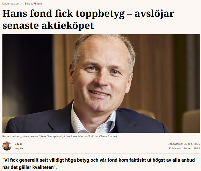 29 september 2025Dagens PS reporter David Ingnäs intervjuar vår förvaltare Roger Hedberg under rubriken - Hans fond fick toppbetyg.